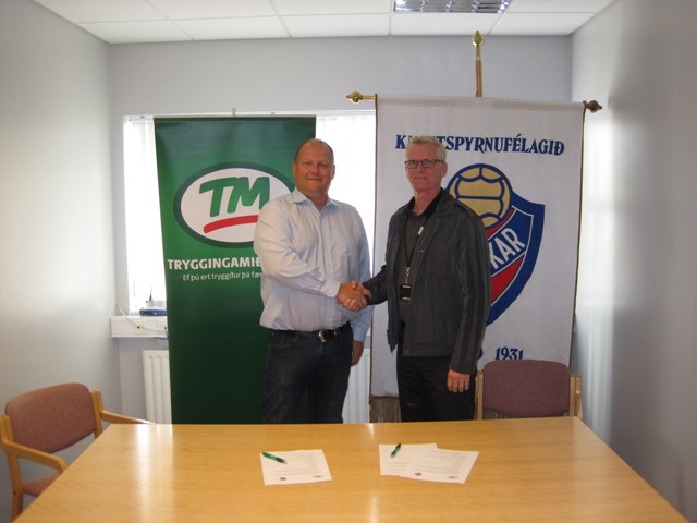 Frá undirritun samningsins. Frá vinstri: Heimir Heimisson framkvæmdastjóri Hauka og Gunnar Oddsson forstöðumaður hjá TMTM og knattspyrnufélagið Haukar hafa undirritað samstarfssamning um að TM verði einn af bakhjörlum Hauka næsta árið. Samningurinn felur meðal annars í sér samstarf um sölu trygginga til félagsmanna en hluti iðgjalds þeirra Haukamanna sem tryggja hjá TM rennur beint sem styrkur til félagsins.